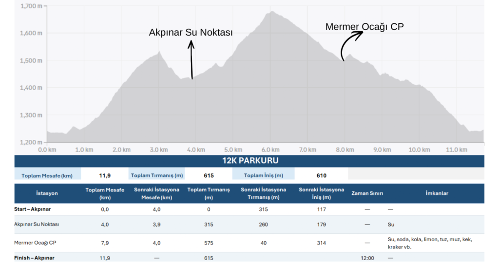 Parkur boyunca 1 adet ikmal istasyonu (CP) bulunacaktır. Hava şartlarına uygun kıyafetler giymeniz beklenmektedir; yanınızda yağmurluk/rüzgarlık bulundurmanız tavsiye edilir.